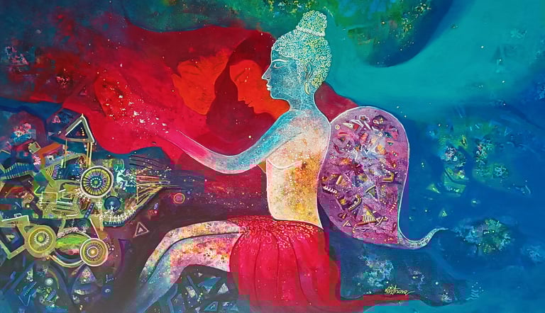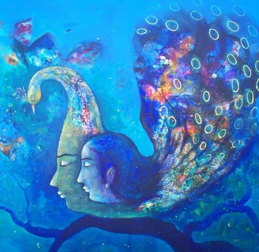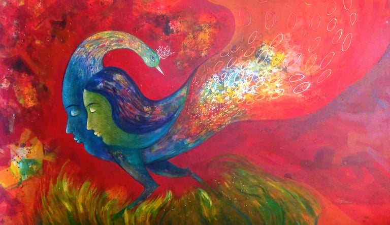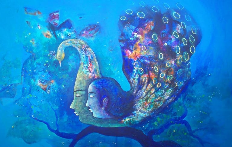 A lyrical portrayal of two souls merging into a divine flight, where individual identities dissolve into a vibrant landscape of passion and peace. This work celebrates love as a sacred journey toward an eternal, harmonious union.