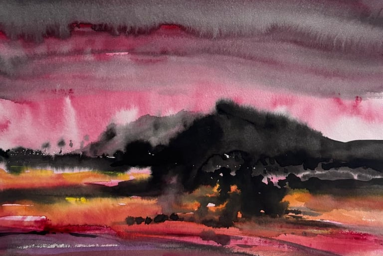A brooding landscape of shifting light and shadow, where land and sky dissolve into emotion.