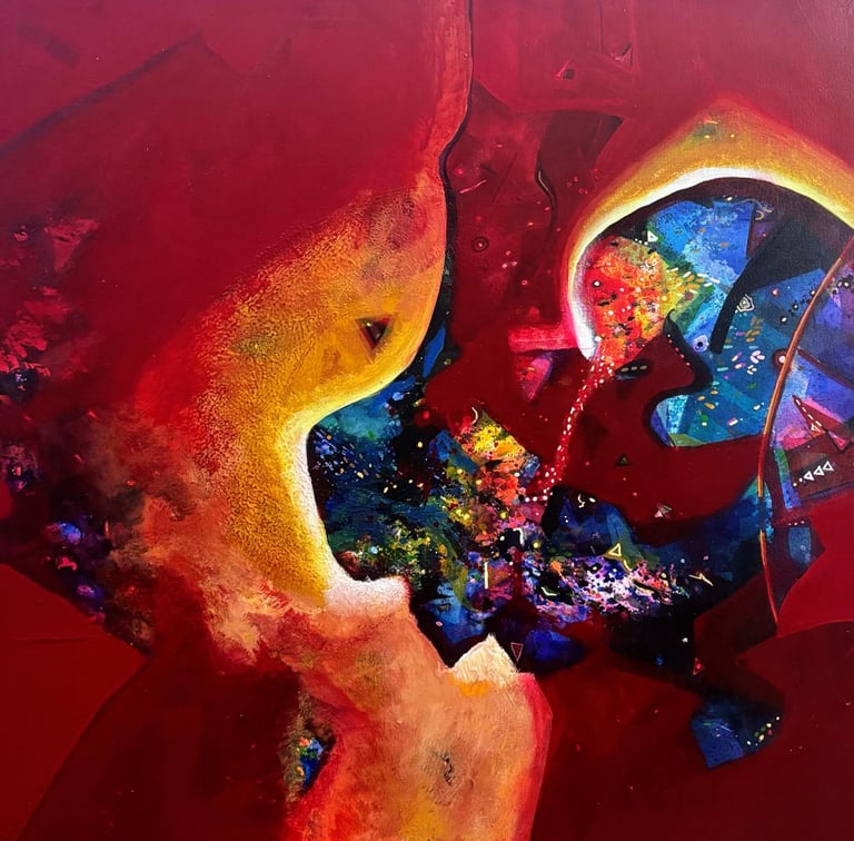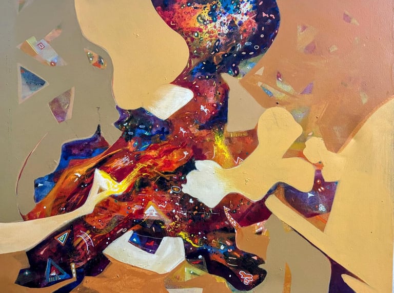 Intersecting forms and shifting energies capture moments of tension and harmony, reflecting emotional crossings and ongoing transformation.