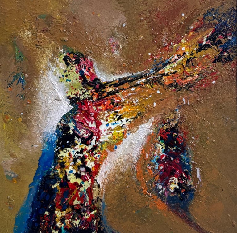 Dynamic strokes and vibrant textures capture the rhythm of movement, where sound, energy, and emotion seem to resonate through space