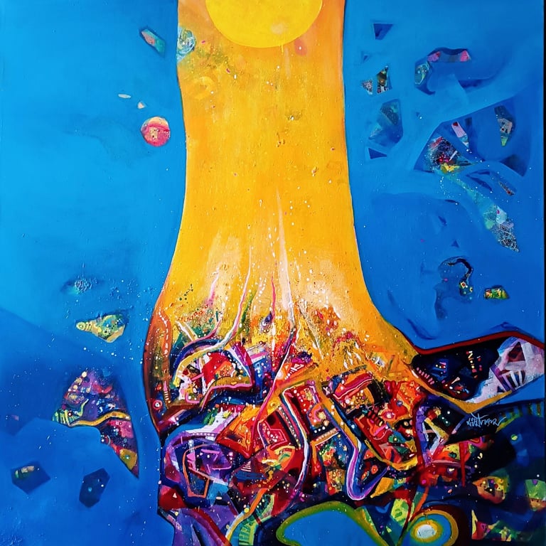 An abstract meditation on praan—the eternal life force—flowing through color, rhythm, and cosmic connection.